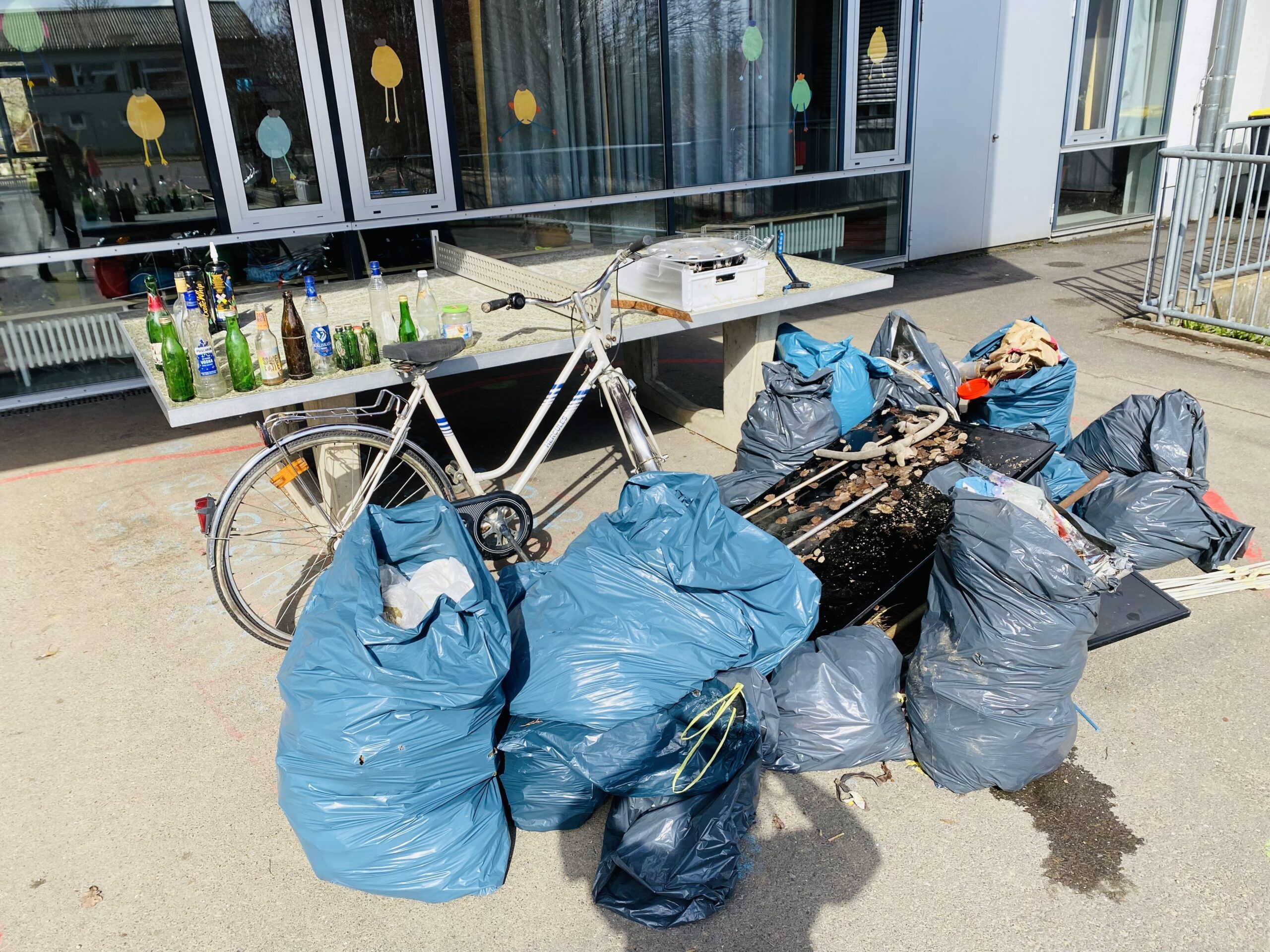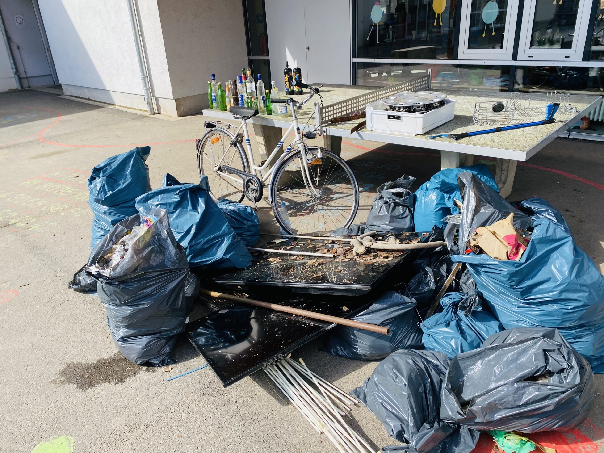 Doch auch größere Fundstücke sorgten für staunende Gesichter. Aus einem Gebüsch wurde ein Fahrrad geborgen, außerdem tauchten zwei alte Bildschirme, eine Wäschespinne und mehrere Autoradkappen auf. Mancher Müllsack füllte sich schneller als gedacht, und die Kinder stellten fest, dass beim Müllsammeln nicht nur ein aufmerksamer Blick, sondern manchmal auch etwas Muskelkraft gefragt ist. Am Ende des Tages war eine beachtliche Menge an Abfall zusammengetragen worden – und viele Schülerinnen und Schüler staunten darüber, was sich im Laufe der Zeit am Wegesrand ansammelt.
